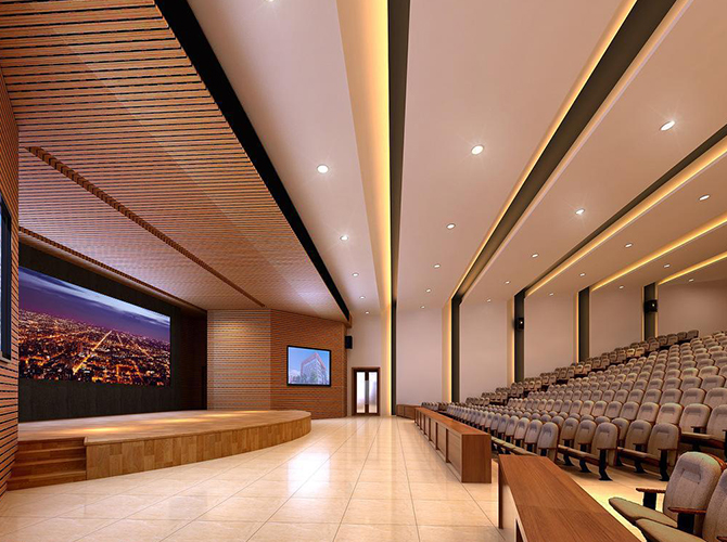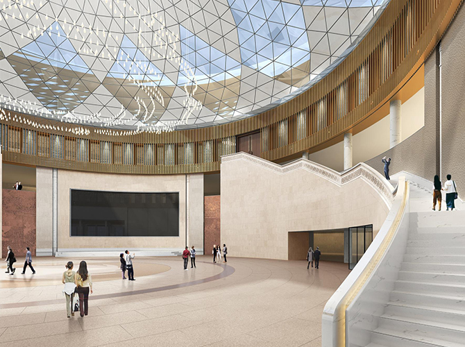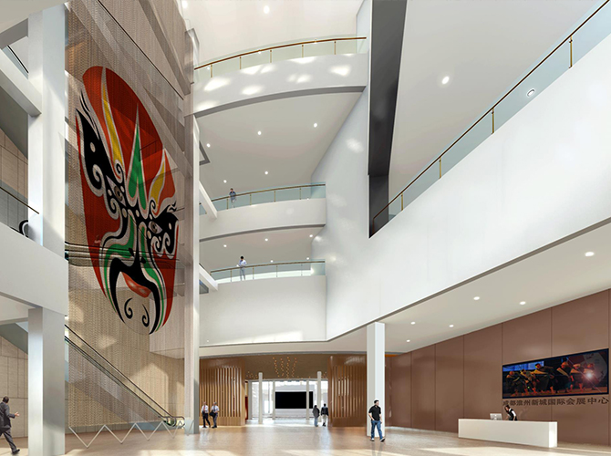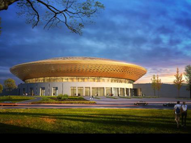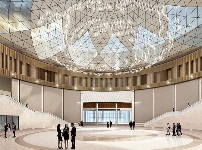 淮州新城国际会展中心采用圆形作为基本形体,通过透明玻璃幕墙从底部托起,营造出建筑整体悬浮半空的姿态,形似“UFO”飞行器。主要分为展览中心、会议中心、航空博物馆和设备用房及库房等辅助功能区三部分功能分区。一层为展厅,服务于未来航空产业产品的展览,二三层为会议功能区,服务于大型航空产业会议的召开,四层为航天博物馆。未来,淮州新城国际会展中心将成为淮州新城通用航空产业对外展示的窗口。