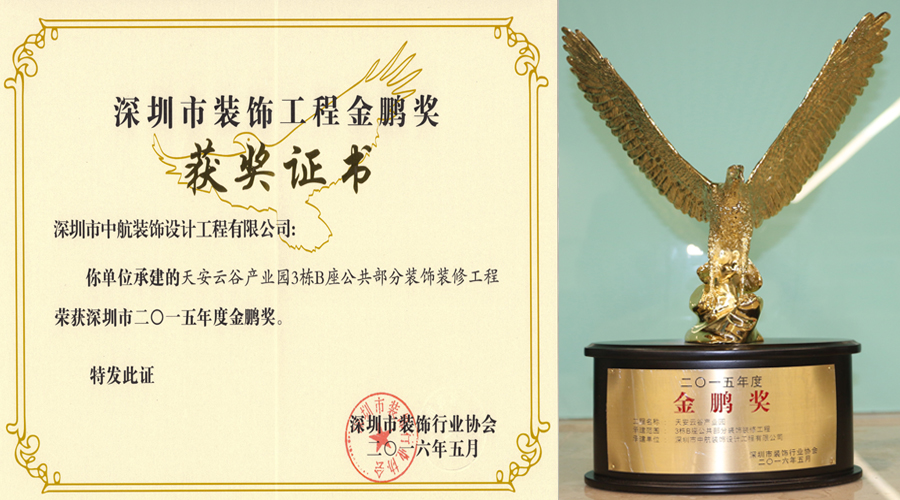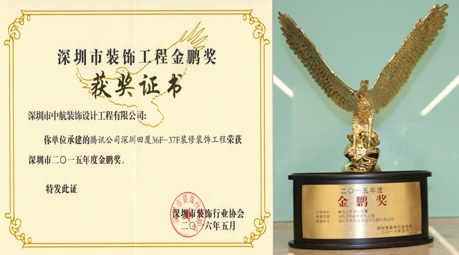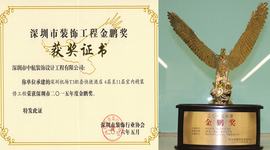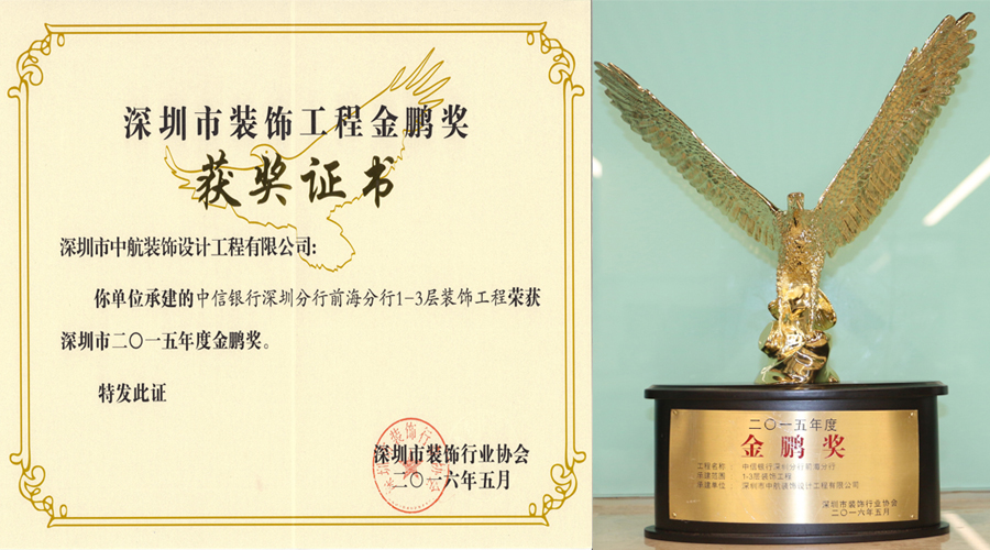 多年来,中航装饰集团不断强化专业技术工艺,工程质量和工程品质稳步提升。中航装饰注重品牌建设,更注重品质建设,我们坚信只有提升品质,才能增创效益。深圳市装饰工程金鹏奖是深圳装饰工程领域的权威评选,这份荣誉的获得是业界专家对我公司装饰装修工程优秀品质的充分认可。我们珍惜这份荣誉的获得,更希望将这份荣誉载入中航装饰的史册,使之延续并发扬光大!