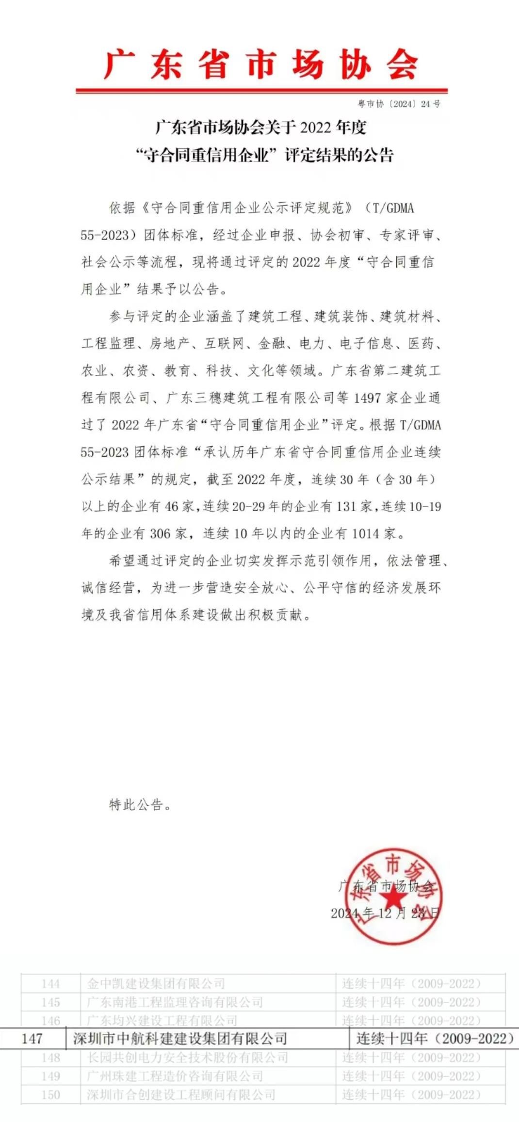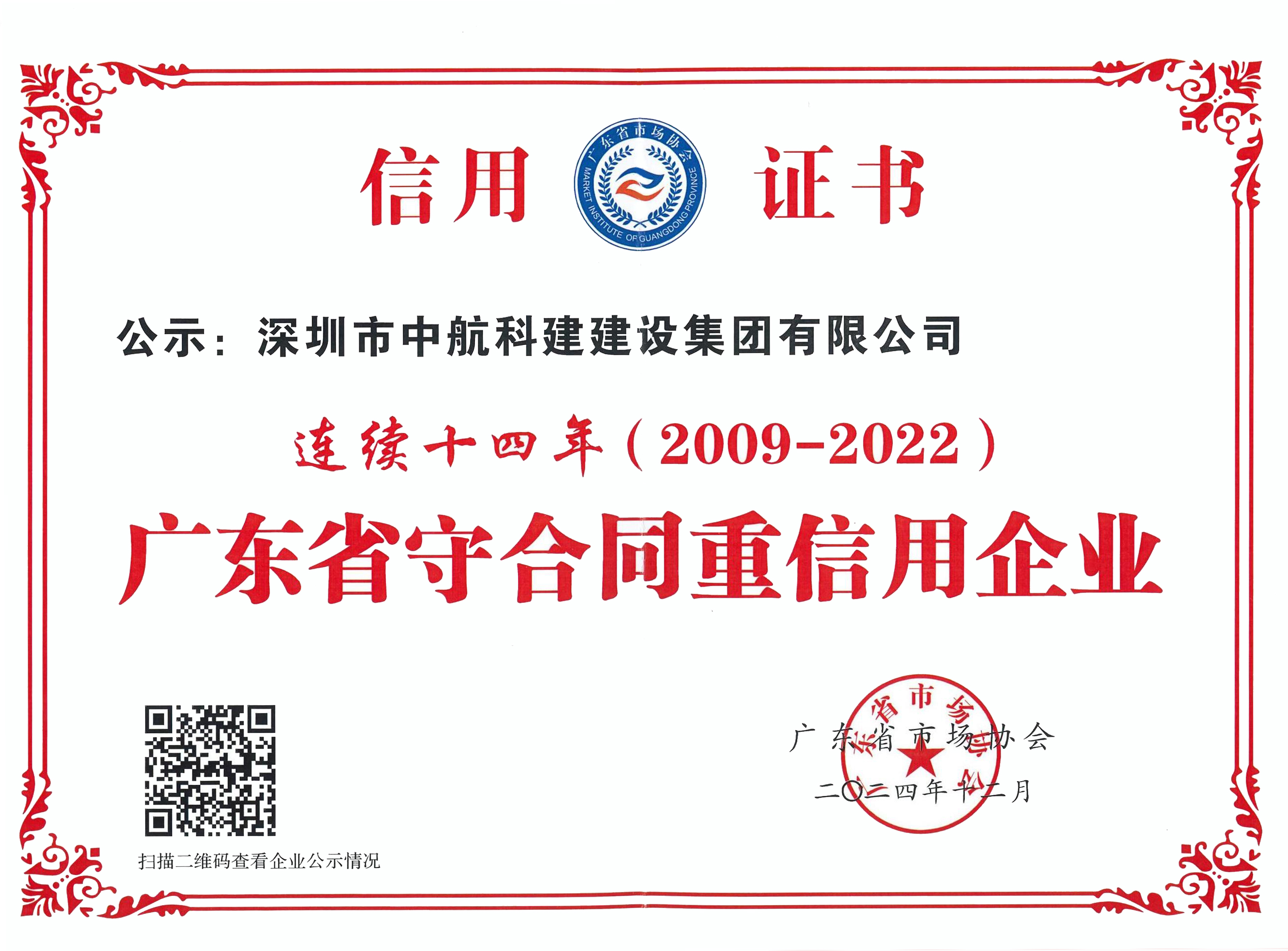近日,广东省市场协会发布2022年度“守合同重信用企业”评选结果。中航科建集团连续十四年荣获广东省“守合同重信用企业”称号。