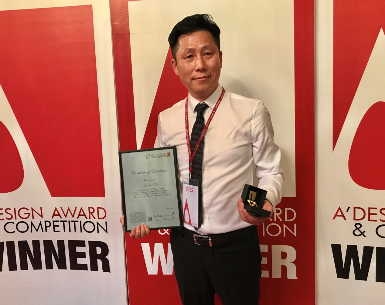 上海瓷忆文化餐厅设计获得金奖,中航装饰设计院院长易强作为设计团队主创设计师与杨超设计师、瓷忆品牌创始人杜银罗先生一道应邀参加了颁奖典礼。