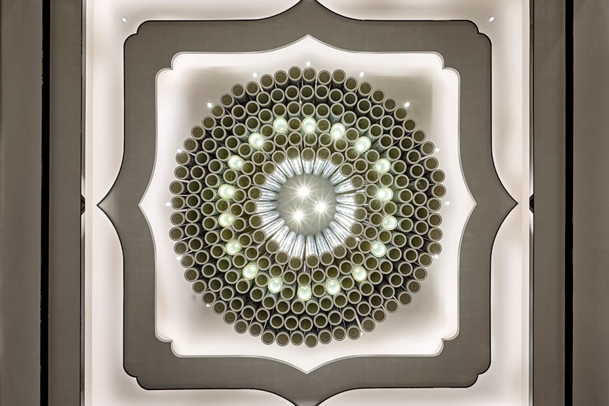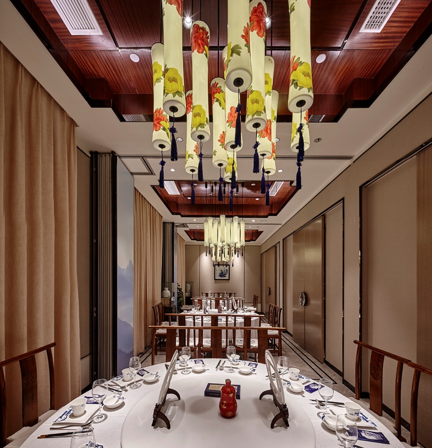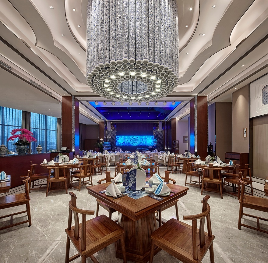 宽敞而对称的宴客大厅,一盏3米直径的巨型吊灯是全场的视觉焦点更是餐厅的点睛之笔,由100个薄胎青花瓷灯拼接而成,堪称世界最大的单体陶瓷吊灯。