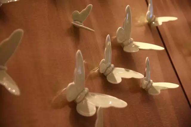 宴客大厅前侧弧形墙上,由平面设计大师杨超教授先生设计了199只翩翩飞舞的粉彩蝴蝶,寓意着贵宾们一生一世情爱久久。
