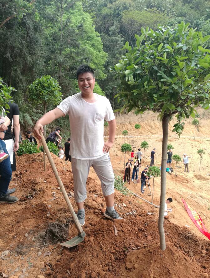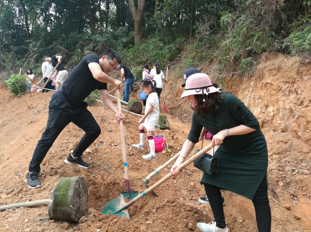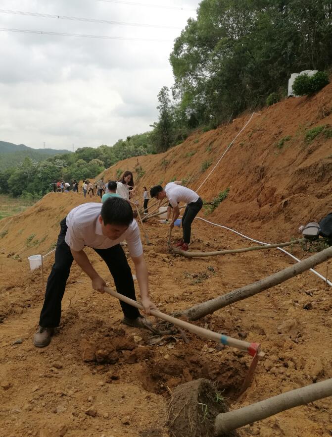 在宝安罗田森林公园植树造林现场,红旗飘扬、横幅高挂,大家顶着炎炎烈日,手拿锄头树苗,挥锄挖土,移栽树苗,一起动手绿化自己的家园。大家三五成群,相互协作,从挖坑整地,栽植树苗,到扶正压实,各道工序一丝不苟,整个植树现场呈现一派热火朝天的劳动景象。经过两个多小时热烈有序的植树劳动,共栽植木苗近百株,罗田森林公园山地上又新添一抹亮丽的新绿。大家看着那一片自己亲手种下的树苗在微风中摇曳,无一不露出幸福的笑容。