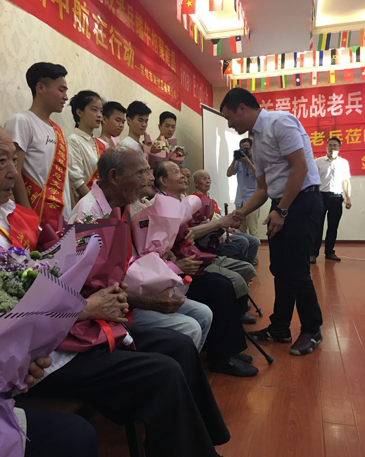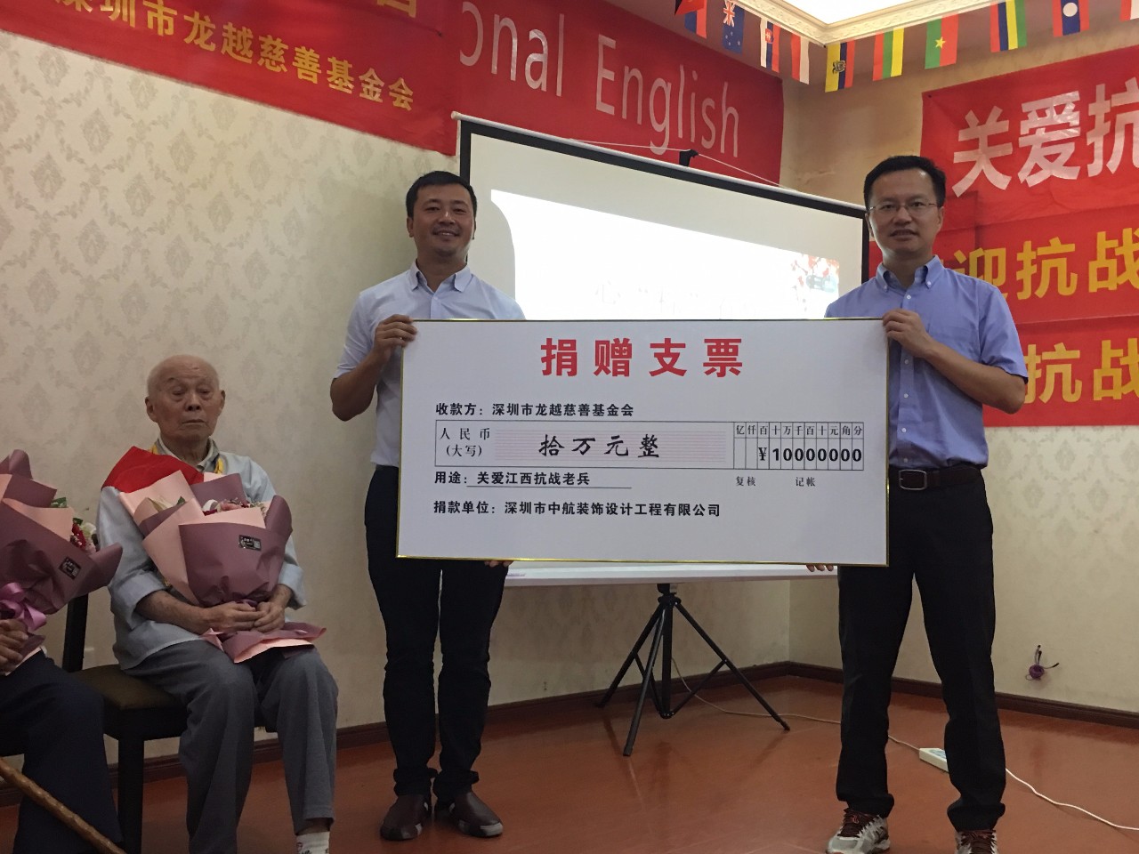 在这和美热烈的气氛中,来自深圳市中航装饰设计工程设计有限公司的副总经理石宣亮代表企业慷慨解囊,为深圳龙越慈善基金会捐赠了10万元人民币,捐款将用于关怀江西地区抗战老兵。随后,副总经理石宣亮还和老兵们友好互动。