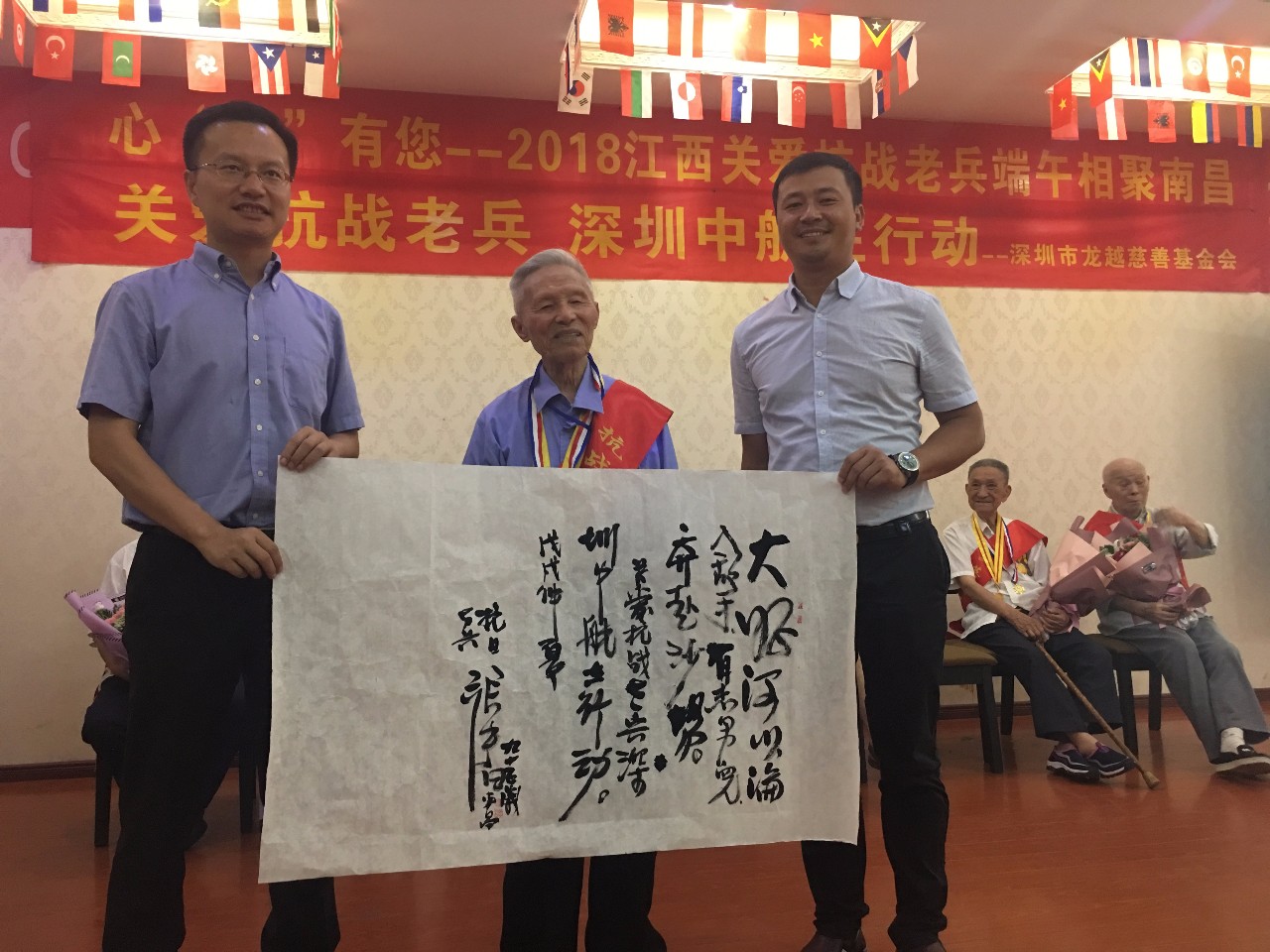 2018年6月15日,就在端午假期的前一个周五。当大家都已经开启悠闲度假心情的时候,有那么一群人,为了在这传统佳节给老兵爷爷们送上祝福,还在勤勤恳恳地忙碌着。在深圳市中航装饰设计工程有限公司的鼎力支持下,深圳市龙越慈善基金会携手南昌守望公益服务中心(关爱抗战老兵江西团队)的志愿者,为八位抗战老兵爷爷筹划了一个别出心裁的致敬活动。