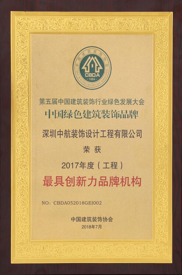 中航装饰集团一直秉承“坚持绿色、创新发展”的理念,勇于承担历史和行业赋予我们的社会责任,为行业的健康平稳发展贡献自己的一份力量。在本次大会上,中航装饰集团荣获中国绿色建筑装饰品牌2017年度(工程)最具创新力品牌机构及2017年度(设计)最具创新力品牌机构两项大奖。