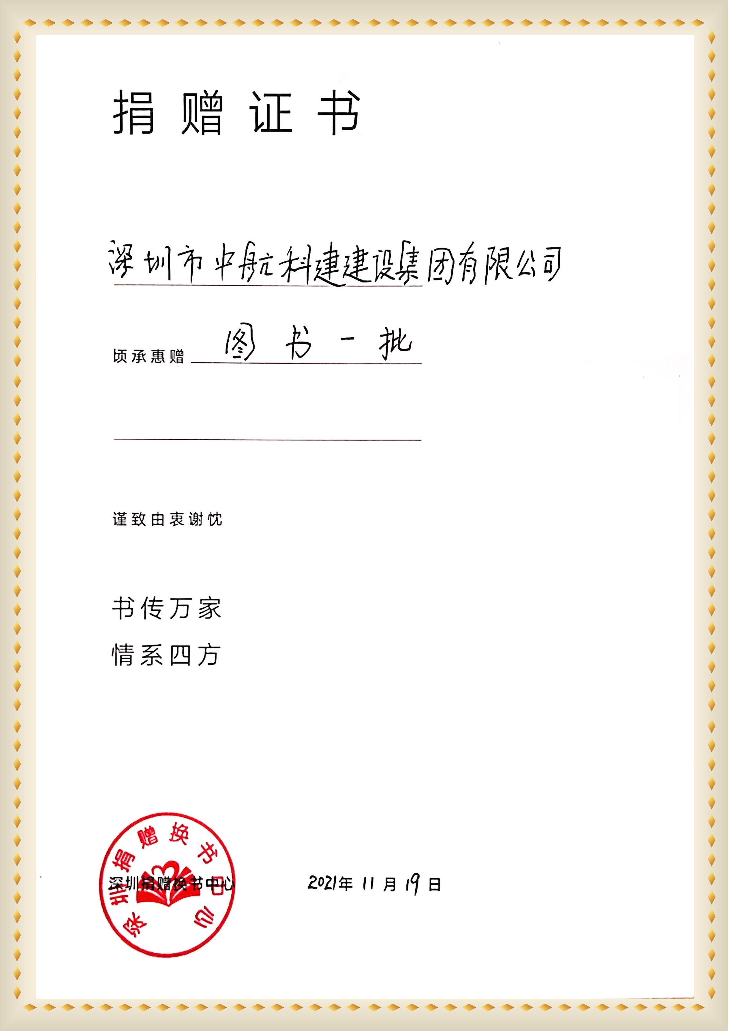 捐书活动现场,中航科建代表将一捆捆打包好的图书搬到阅览室,浓郁的书香飘满图书馆的同时,也为每年的深圳市开展“读书月”活动贡献力量。图书馆为中航科建颁发爱心捐赠证书,并表示 “非常感谢爱心企业捐赠的书,我们一定会妥善保管,让更多全市居民走进图书阅览室,享受到读书带来的乐趣。”