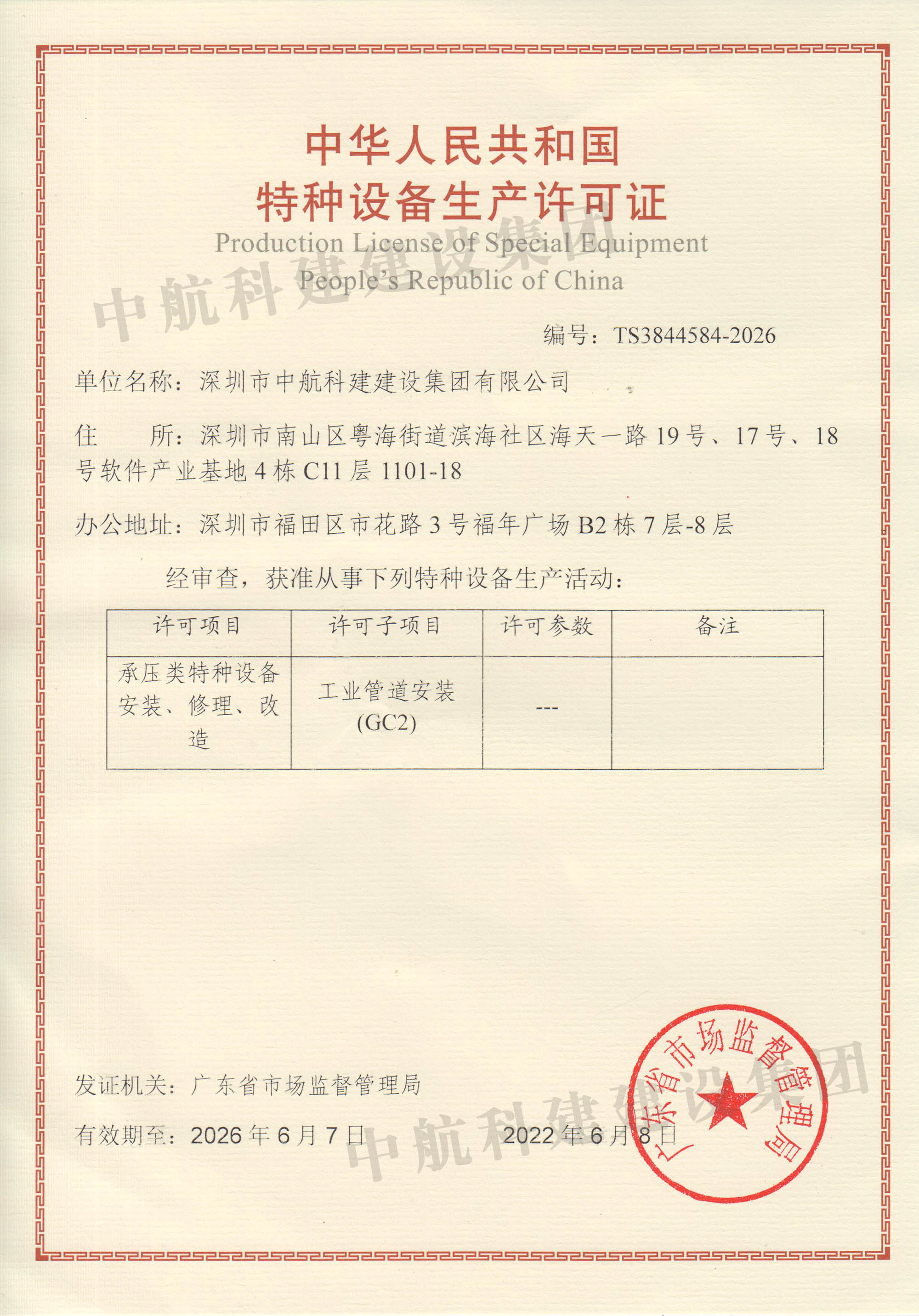 近年来,中航科建建设集团稳步发展,不断构建完备的资质体系。今年年初获得压力管道(GC2)安装许可证,进一步增强了中航科建在医疗、大健康等专业细分领域施工的能力。