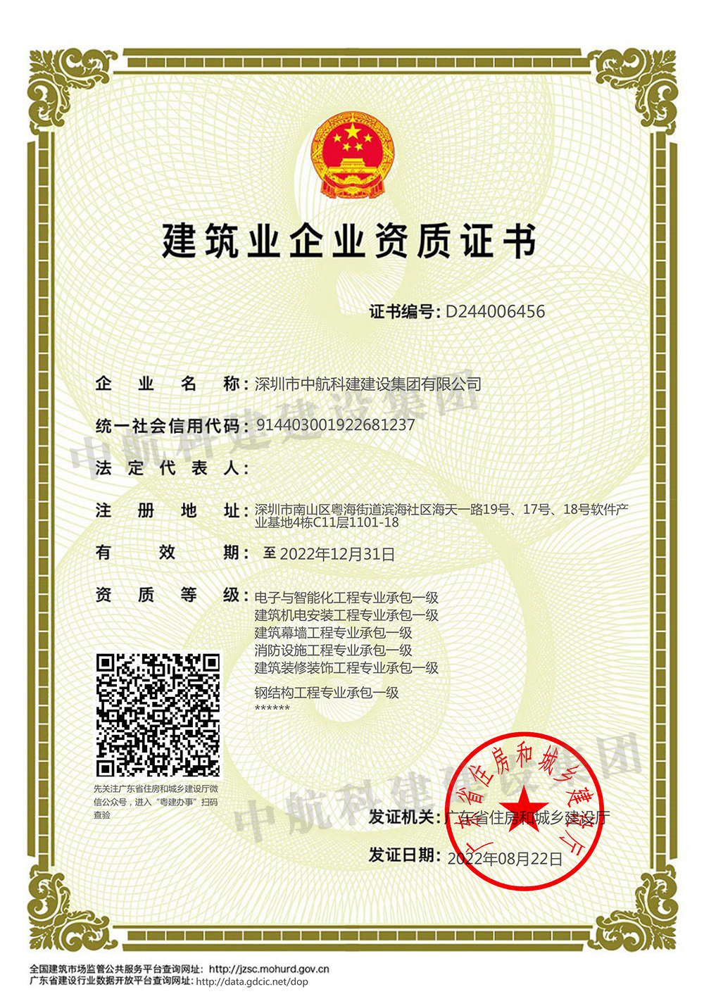 经广东省住房和城乡建设厅审核批准,中航科建建设集团钢结构工程专业承包资质荣升为一级资质,彰显了集团持续良好发展的决心和势头。