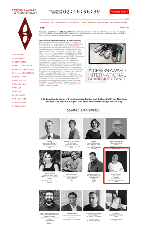 多年来他受邀担任意大利A Design Award 设计大奖|国际评审、中国百强H.Design酒店设计大赛专家评审、中国建筑学会室内设计奖|专业评委、深圳市住建局政府特聘|专家评委、中国未来空间设计大赛寻星奖|专家评委、中国祝融奖总决赛|专业评委等多个设计大赛的专业评审,其中2019至2023年连续五年受邀意大利A设计奖担任建筑与室内单元国际评委。