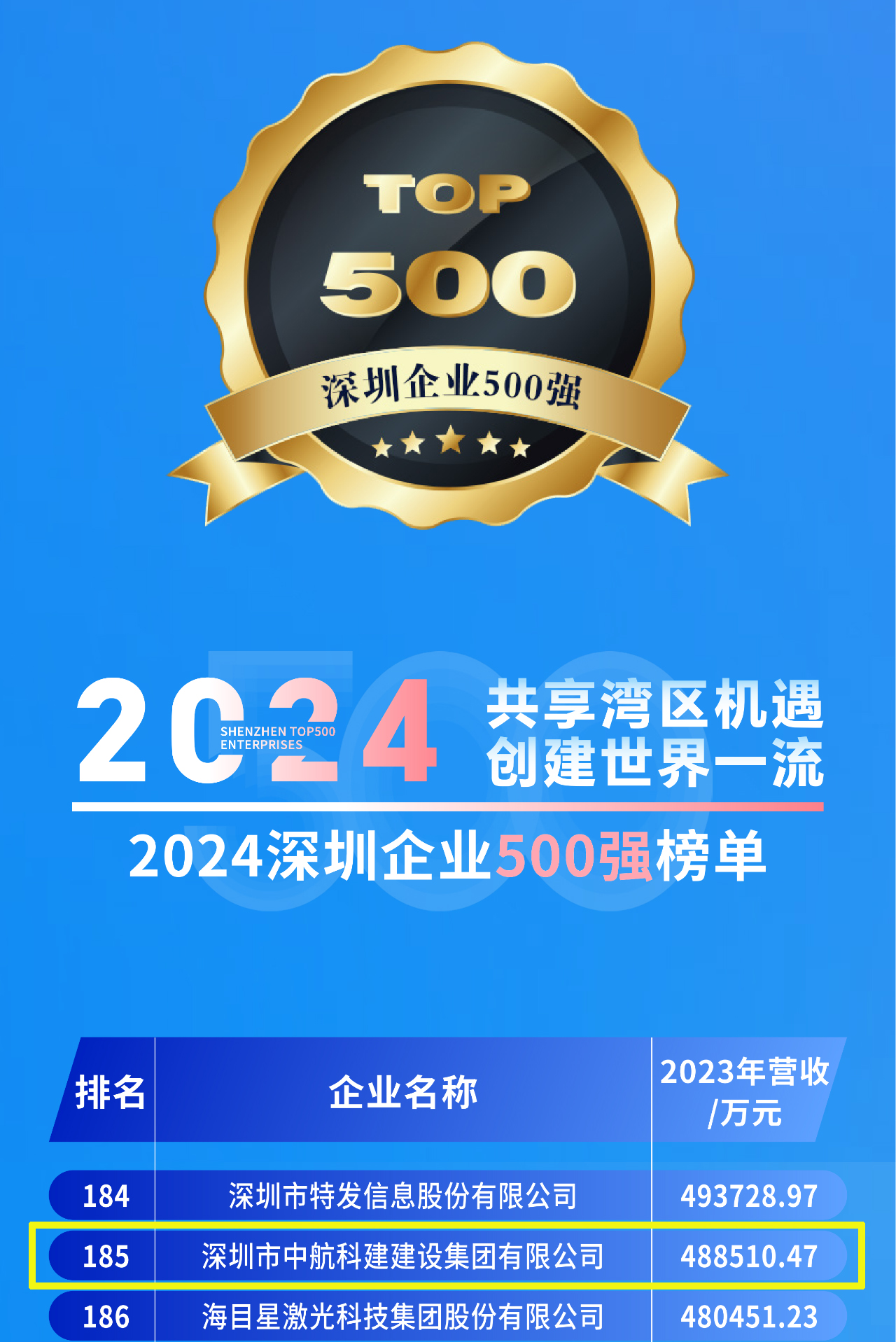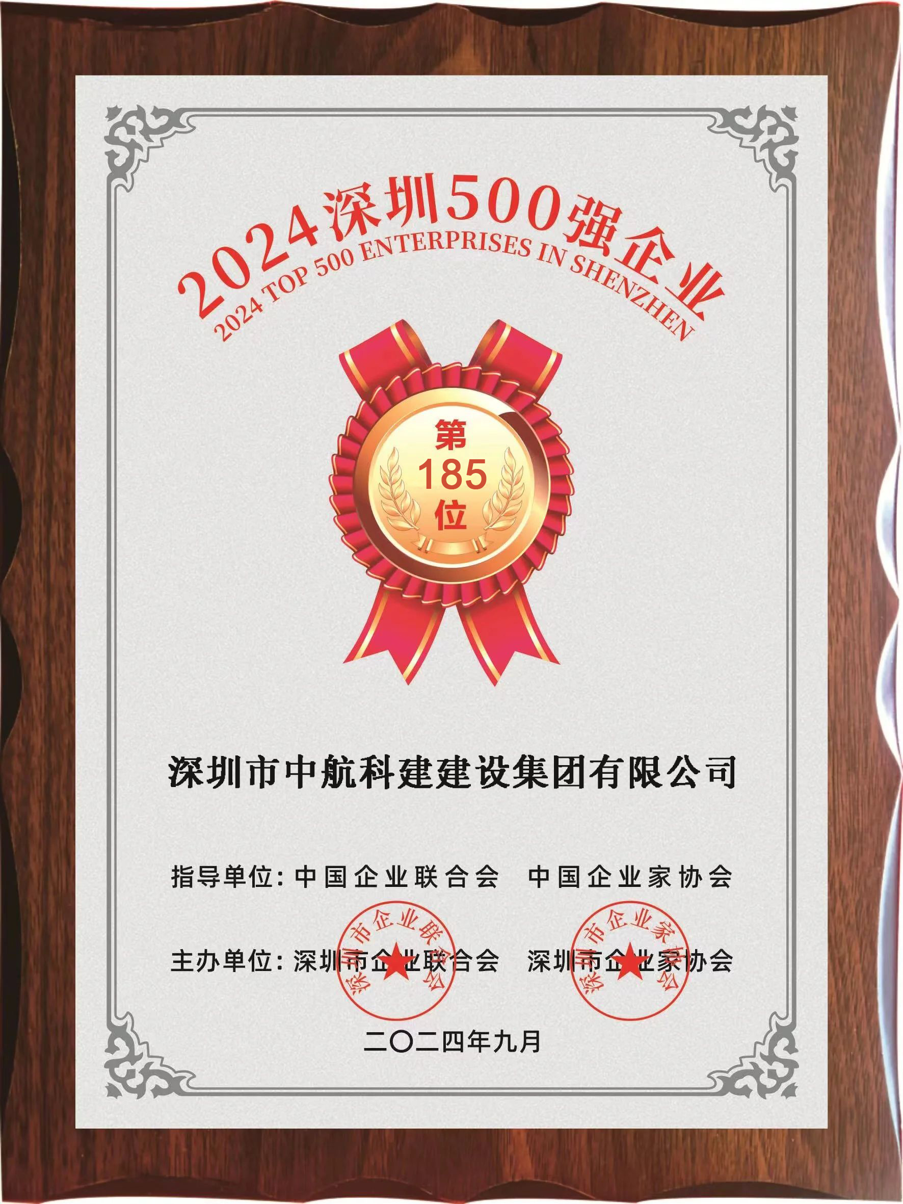 近日,深圳市企业联合会与深圳市企业家协会联合发布了备受瞩目的“2024深圳企业500强榜单”及《2024深圳500强企业发展报告》,中航科建建设集团凭借其卓越的经营业绩和稳健的发展趋势,再度上榜,位列第185位。