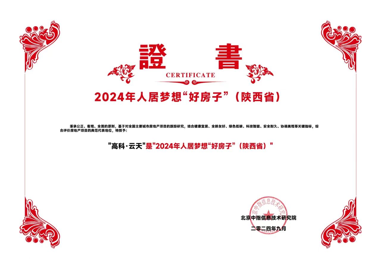 高科•云天作为西安划时代里程碑项目,在“2024中国房地产品牌价值研究成果发布会暨第二十一届中国房地产品牌发展论坛”,获得了2024人居梦想“好房子”的荣誉。这是行业内的高度认可,更是高科•云天品质实力的体现。