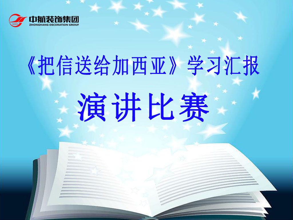 2015年10月中航装饰集团行政管理中心组织集团总部员工进行了优秀励志著作《把信送给加西亚》的学习,为推动此次学习活动的深入,展现员工的风采,增进各部门之间的交流,2016年1月22日,以忠诚、敬业、勤奋为主题的《把信送给加西亚》学习汇报演讲比赛在中航装饰多功能厅激情开讲。