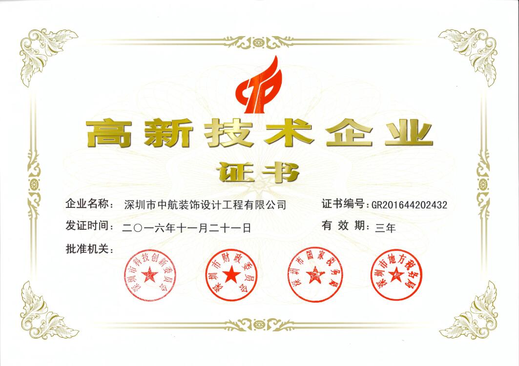 日前,经深圳市科技创新委员会、深圳市财政委员会、深圳市国家税务局、深圳市地方税务局的层层筛选与严格评审,中航装饰集团顺利通过审核,被认定为高新技术企业。