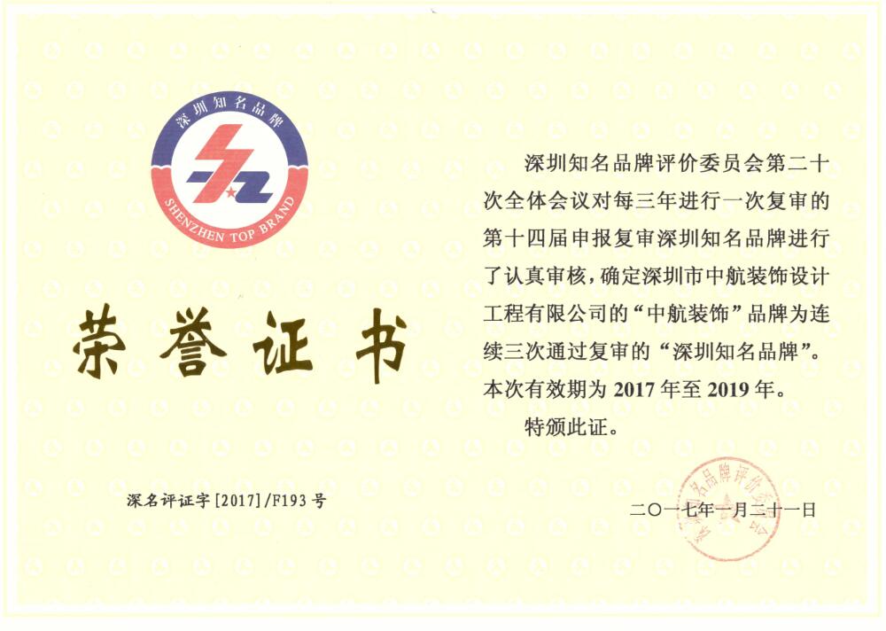 中航装饰再次成功荣获“深圳知名品牌”荣誉称号